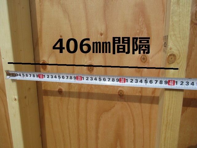 この間隔は壁内のスタッドのみならず2階の床(2×10の材)、2階の天井(2×4材)、屋根(2×6材)、全てのツーバイ材の間隔が406㎜なります。