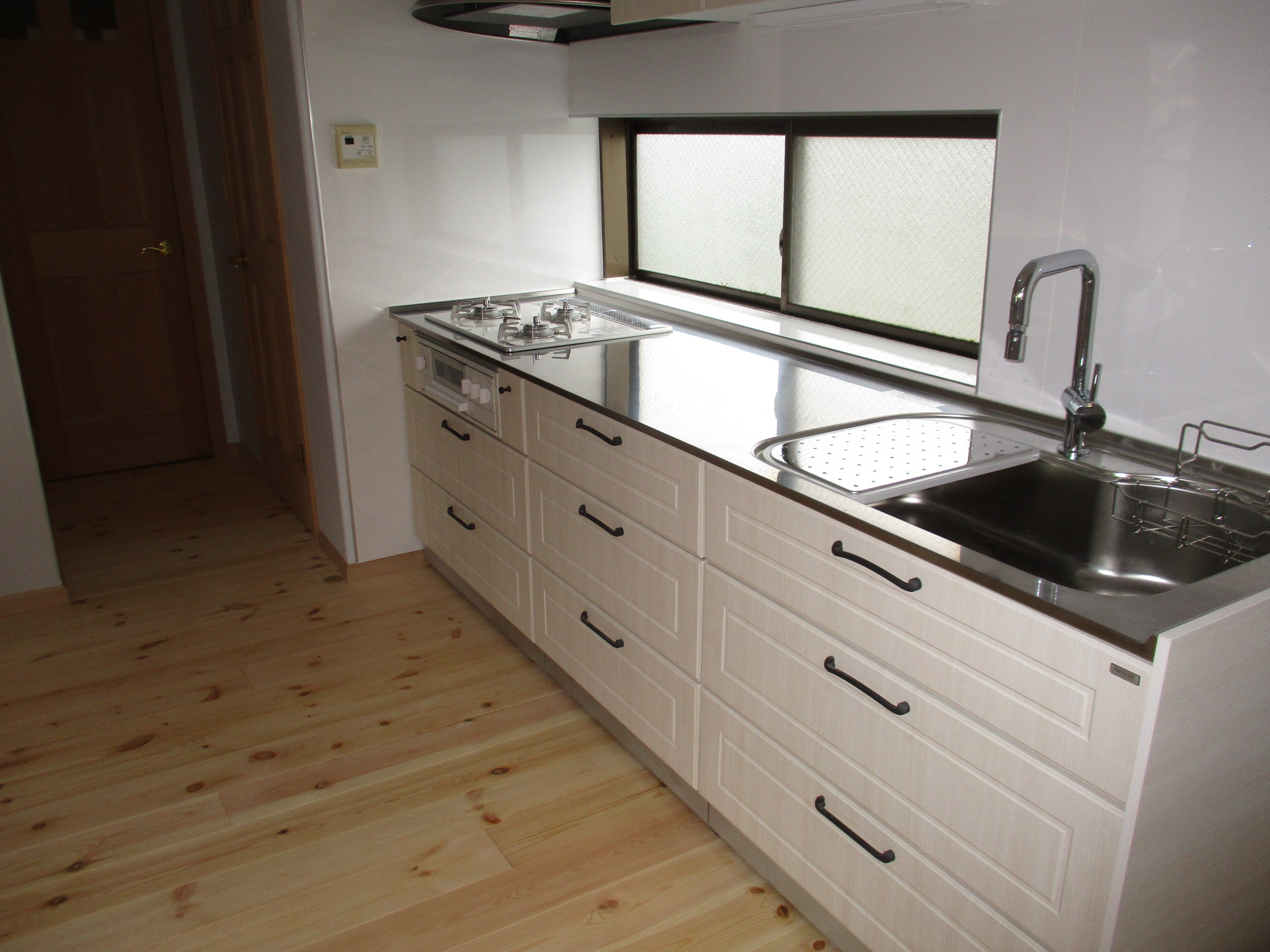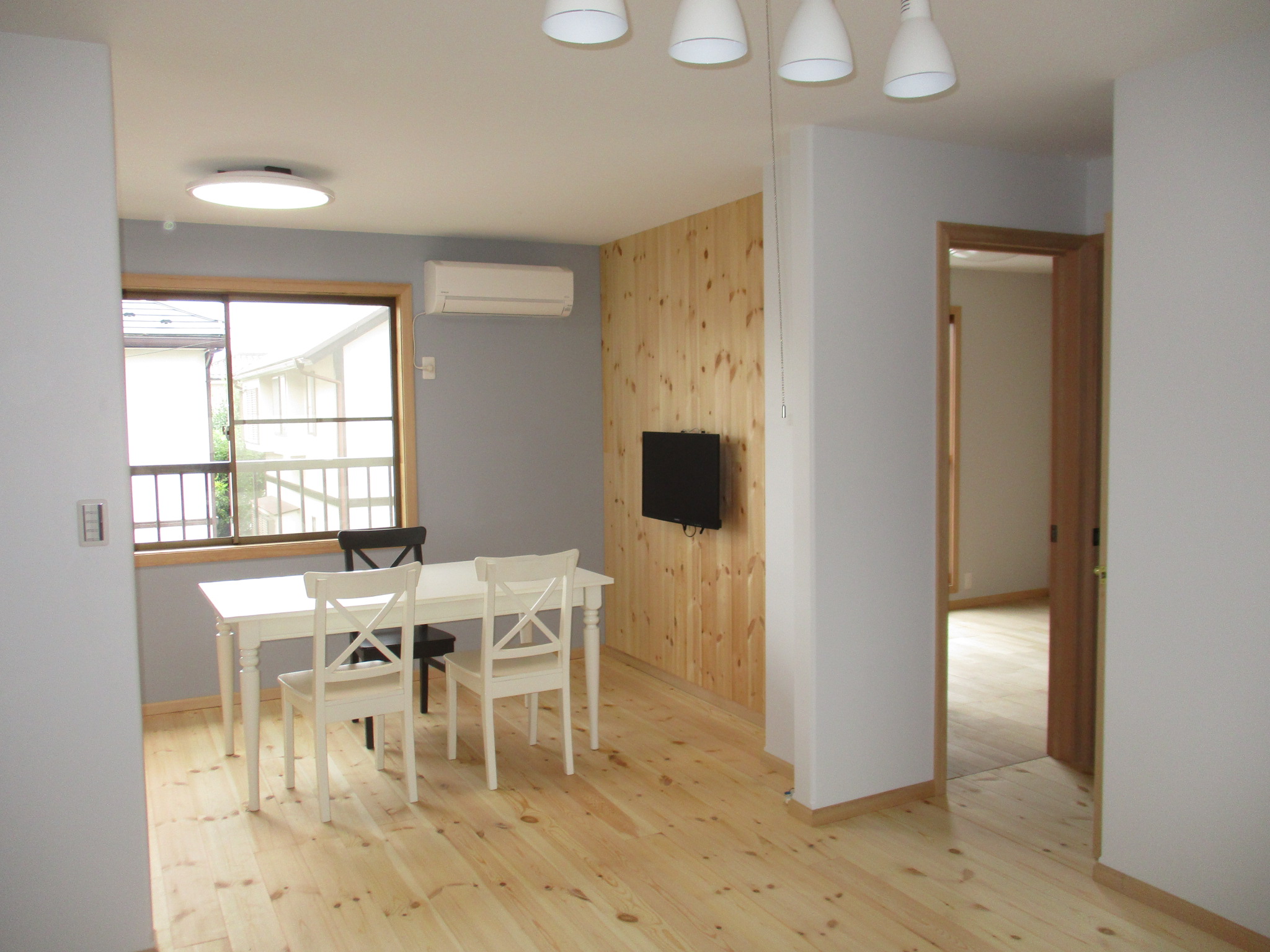 ●キッチン: 幅1800を幅2550に交換 ●間取り: 和室2室含む3DKを2LDKに変更し全室無垢のフローリングに変更 ●全室ドライウォールに変更 ●洗面台: